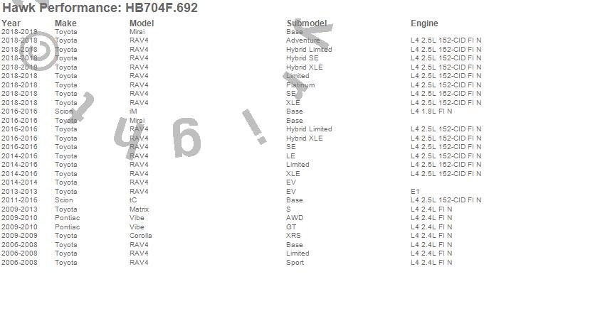 Below is an abreviated list of applications for the HPS Disc Brake Pad.Corolla, iM, Matrix, Mirai, RAV4, tC, Vibe, Pontiac, Scion, Toyota, 2019, 2018, 2016, 2015, 2014, 2013, 2012, 2011, 2010, 2009 moreā¦