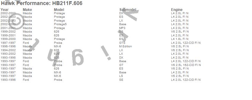 Below is an abreviated list of applications for the HPS Disc Brake Pad.626, MX-6, Probe, Protege, Protege5, Ford, Mazda, 2003, 2002, 2001, 2000, 1999, 1998, 1997, 1996, 1995, 1994, 1993 moreā¦