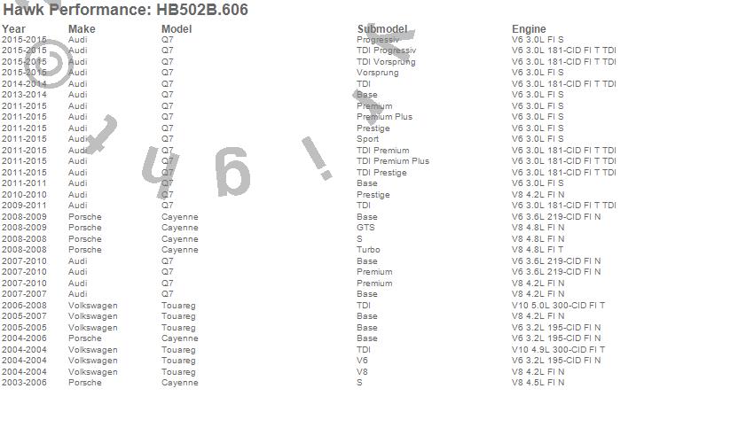 Below is an abreviated list of applications for the HPS 5.0 Disc Brake Pad.