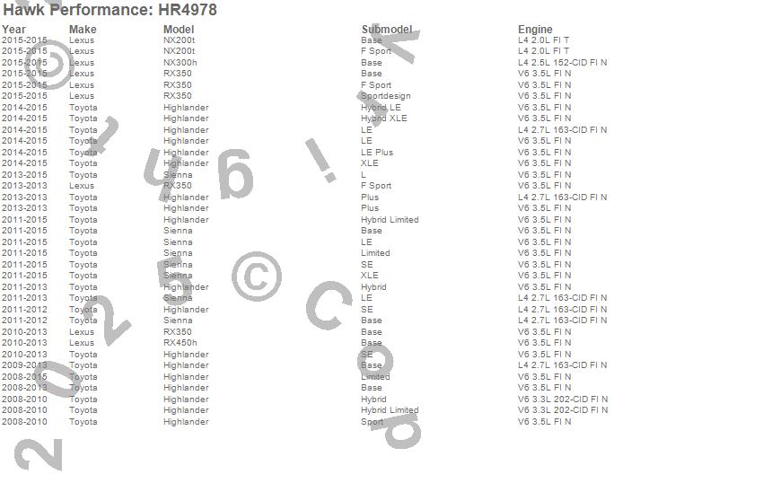 Below is an abreviated list of applications for the Sector 27 Rotor.Highlander, NX200t, NX300h, RX350, RX450h, Sienna, Lexus, Toyota, 2015, 2014, 2013, 2012, 2011, 2010, 2009, 2008 moreā¦