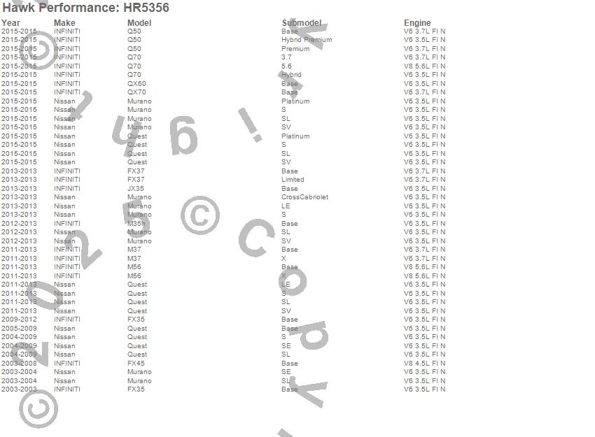 Below is an abreviated list of applications for the Sector 27 Rotor.FX35, FX37, FX45, JX35, M35h, M37, M56, Murano, Q50, Q70, Quest, QX60, QX70, INFINITI, Nissan, 2015, 2013, 2012, 2011, 2010 moreā¦