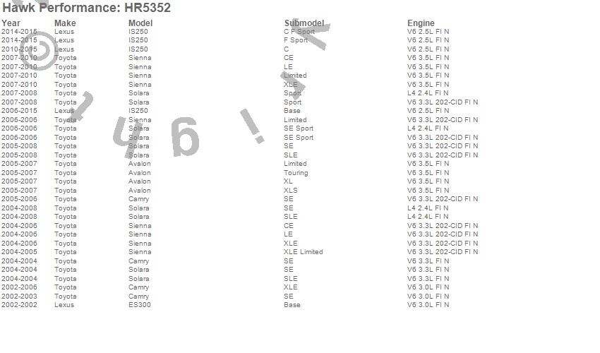 Below is an abreviated list of applications for the Sector 27 Rotor.Avalon, Camry, ES300, IS250, Sienna, Solara, Lexus, Toyota, 2015, 2014, 2013, 2012, 2011, 2010, 2009, 2008, 2007, 2006, 2005, 2004 moreā¦