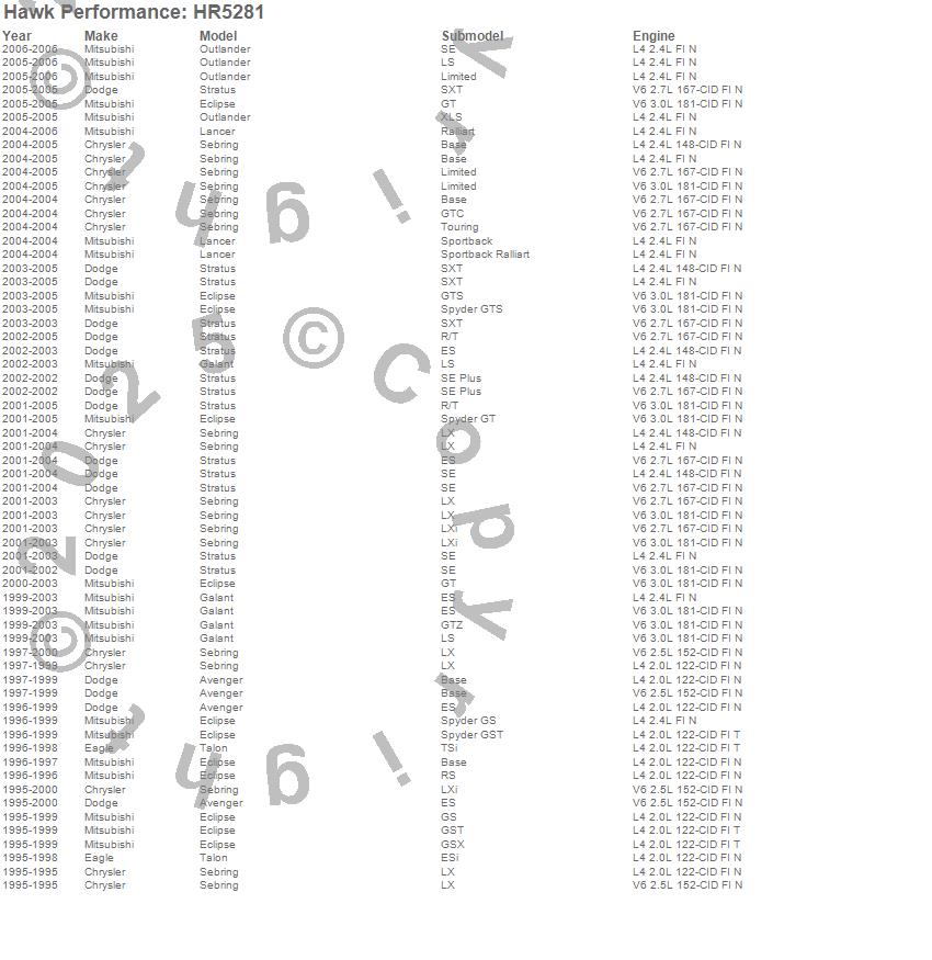 Below is an abreviated list of applications for the Sector 27 Rotor.Avenger, Eclipse, Galant, Lancer, Outlander, Sebring, Stratus, Talon, Chrysler, Dodge, Eagle, Mitsubishi, 2006, 2005, 2004, 2003, 2002, 2001, 2000, 1999 moreā¦