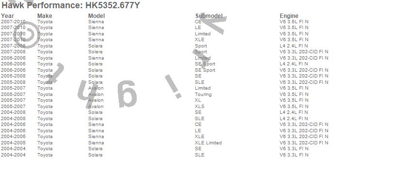 Below is an abreviated list of applications for the Sector 27 Brake Kits.Avalon, Sienna, Solara, Toyota, 2010, 2009, 2008, 2007, 2006, 2005, 2004 moreā¦