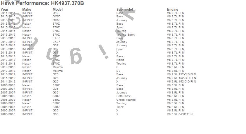 Below is an abreviated list of applications for the Sector 27 Brake Kits.350Z, 370Z, EX37, G25, G35, G37, Maxima, Q40, QX50, INFINITI, Nissan, 2015, 2013, 2012, 2011, 2009, 2008, 2007, 2006, 2005 moreā¦