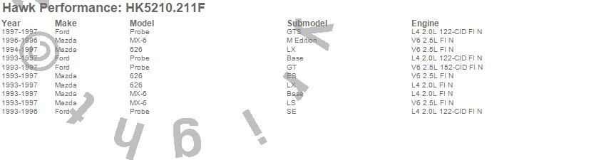Below is an abreviated list of applications for the Sector 27 Brake Kits.626, MX-6, Probe, Ford, Mazda, 1997, 1996, 1995, 1994, 1993 moreā¦