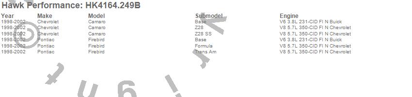 Below is an abreviated list of applications for the Sector 27 Brake Kits.Camaro, Firebird, Chevrolet, Pontiac, 2002, 2001, 2000, 1999, 1998 moreā¦