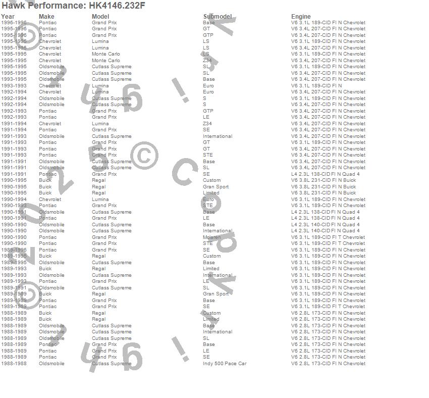 Below is an abreviated list of applications for the Sector 27 Brake Kits.Cutlass Supreme, Grand Prix, Lumina, Monte Carlo, Regal, Buick, Chevrolet, Oldsmobile, Pontiac, 1996, 1995, 1994, 1993, 1992, 1991, 1990, 1989, 1988 moreā¦
