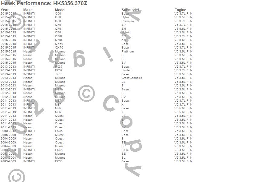 Below is an abreviated list of applications for the Sector 27 Brake Kits.FX35, FX37, FX45, JX35, M35h, M37, M56, Murano, Q50, Q70, Q70L, Quest, QX60, QX70, INFINITI, Nissan, 2015, 2013, 2012, 2011 moreā¦