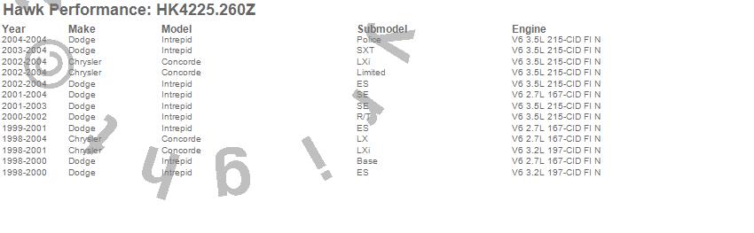 Below is an abreviated list of applications for the Sector 27 Brake Kits.Concorde, Intrepid, Chrysler, Dodge, 2004, 2003, 2002, 2001, 2000, 1999, 1998 moreā¦