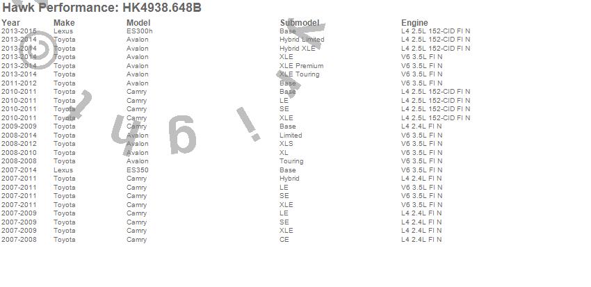 Below is an abreviated list of applications for the Sector 27 Brake Kits.Avalon, Camry, ES300h, ES350, Lexus, Toyota, 2015, 2014, 2013, 2012, 2011, 2010, 2009, 2008, 2007 moreā¦