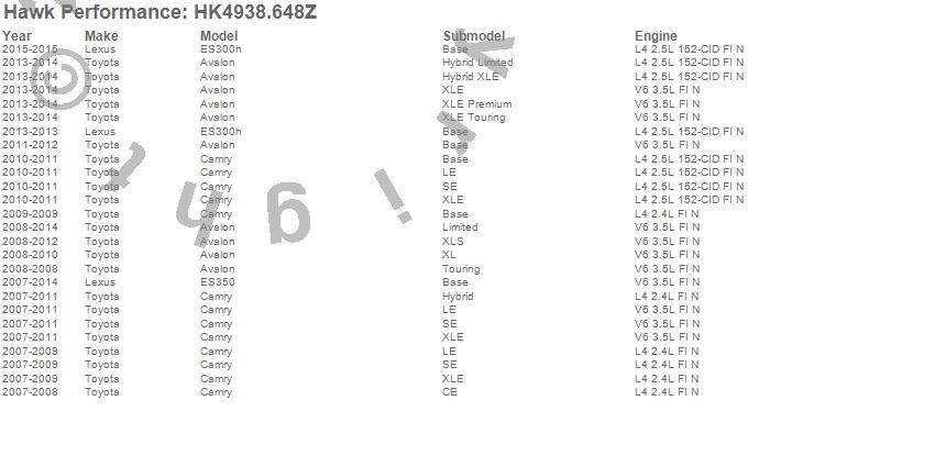 Below is an abreviated list of applications for the Sector 27 Brake Kits.Avalon, Camry, ES300h, ES350, Lexus, Toyota, 2015, 2014, 2013, 2012, 2011, 2010, 2009, 2008, 2007 moreā¦