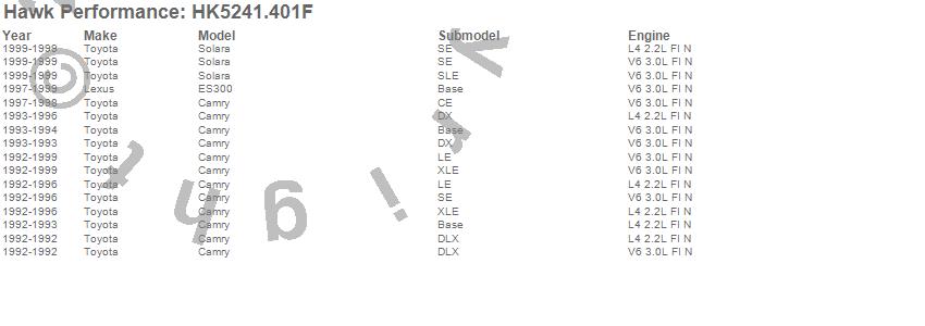 Below is an abreviated list of applications for the Sector 27 Brake Kits.Camry, ES300, Solara, Lexus, Toyota, 1999, 1998, 1997, 1996, 1995, 1994, 1993, 1992 moreā¦
