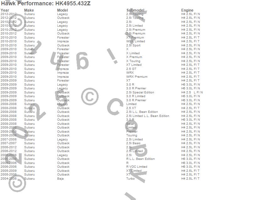 Below is an abreviated list of applications for the Sector 27 Brake Kits.Baja, Forester, Impreza, Legacy, Outback, Subaru, 2012, 2011, 2010, 2009, 2008, 2007, 2006, 2005, 2004 moreā¦
