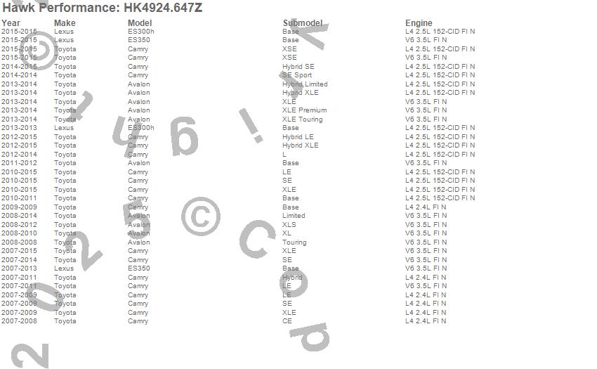 Below is an abreviated list of applications for the Sector 27 Brake Kits.Avalon, Camry, ES300h, ES350, Lexus, Toyota, 2015, 2014, 2013, 2012, 2011, 2010, 2009, 2008, 2007 moreā¦