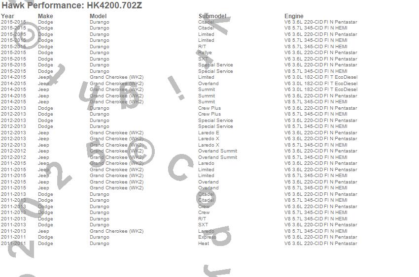 Below is an abreviated list of applications for the Sector 27 Brake Kits.Durango, Grand Cherokee (WK2), Dodge, Jeep, 2015, 2014, 2013, 2012, 2011 moreā¦