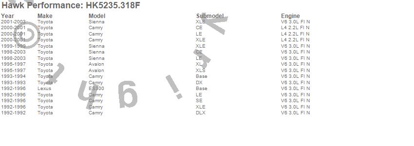 Below is an abreviated list of applications for the Sector 27 Brake Kits.Avalon, Camry, ES300, Sienna, Lexus, Toyota, 2003, 2002, 2001, 2000, 1999, 1998, 1997, 1996, 1995, 1994, 1993, 1992 moreā¦