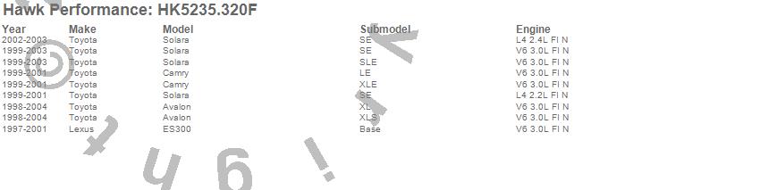 Below is an abreviated list of applications for the Sector 27 Brake Kits.Avalon, Camry, ES300, Solara, Lexus, Toyota, 2004, 2003, 2002, 2001, 2000, 1999, 1998, 1997 moreā¦