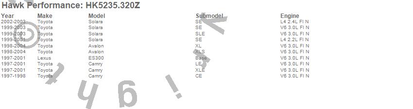 Below is an abreviated list of applications for the Sector 27 Brake Kits.Avalon, Camry, ES300, Solara, Lexus, Toyota, 2004, 2003, 2002, 2001, 2000, 1999, 1998, 1997 moreā¦