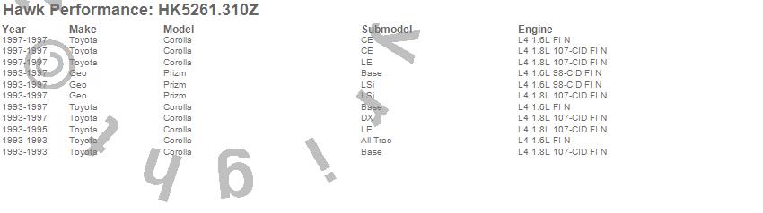 Below is an abreviated list of applications for the Sector 27 Brake Kits.Corolla, Prizm, Geo, Toyota, 1997, 1996, 1995, 1994, 1993 moreā¦