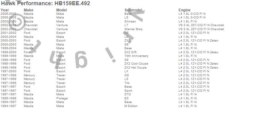 Below is an abreviated list of applications for the Blue 42 Disc Brake Pad.Escort, Miata, Protege, Tracer, Venture, Chevrolet, Ford, Mazda, Mercury, 2005, 2004, 2003, 2002, 2001, 2000, 1999, 1998, 1997, 1996, 1995 moreā¦