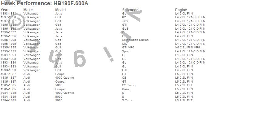 Below is an abreviated list of applications for the HPS Disc Brake Pad.4000 Quattro, 5000, Coupe, Golf, Jetta, Audi, Volkswagen, 1998, 1997, 1996, 1995, 1994, 1993, 1987, 1986, 1985, 1984 moreā¦