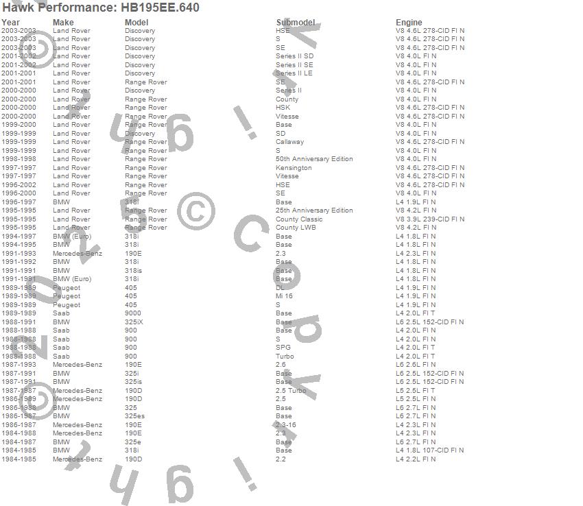 Below is an abreviated list of applications for the Blue 42 Disc Brake Pad.190D, 190E, 318i, 318is, 325, 325e, 325es, 325i, 325is, 325iX, 405, 900, 9000, Discovery, Range Rover, BMW, BMW (Euro), Land Rover, Mercedes-Benz, Peugeot moreā¦