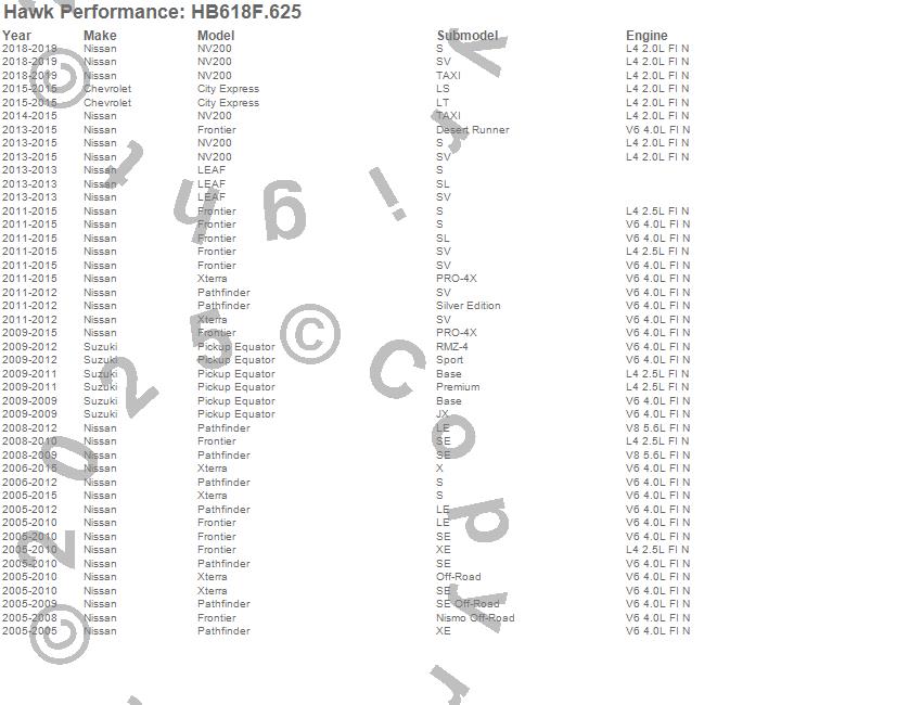 Below is an abreviated list of applications for the HPS Disc Brake Pad.City Express, Equator, Frontier, LEAF, NV200, Pathfinder, Xterra, Chevrolet, Nissan, Suzuki, 2019, 2018, 2015, 2014, 2013, 2012, 2011, 2010, 2009, 2008 moreā¦