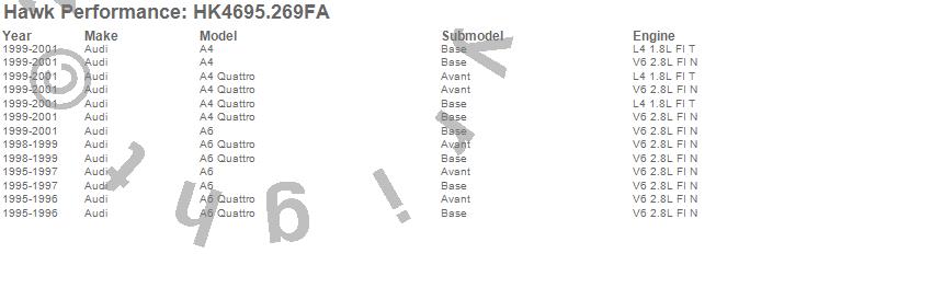 Below is an abreviated list of applications for the Sector 27 Brake Kits.A4, A4 Quattro, A6, A6 Quattro, Audi, 2001, 2000, 1999, 1998, 1997, 1996, 1995 moreā¦