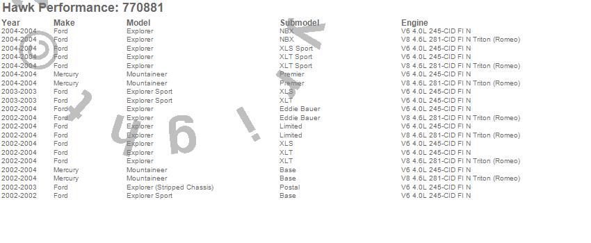 Below is an abreviated list of applications for the OES Disc Brake Pads.Explorer, Explorer (Stripped Chassis), Explorer Sport, Mountaineer, Ford, Mercury, 2004, 2003, 2002 moreā¦