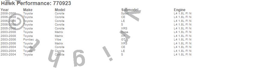 Below is an abreviated list of applications for the OES Disc Brake Pads.Corolla, Matrix, Vibe, Pontiac, Toyota, 2008, 2007, 2006, 2005, 2004, 2003 moreā¦