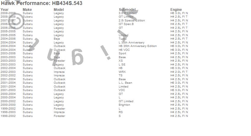 Below is an abreviated list of applications for the Disc Brake Pad.Baja, Forester, Impreza, Legacy, Outback, Subaru, 2009, 2008, 2007, 2006, 2005, 2004, 2003, 2002, 2001, 2000, 1999, 1998 moreā¦