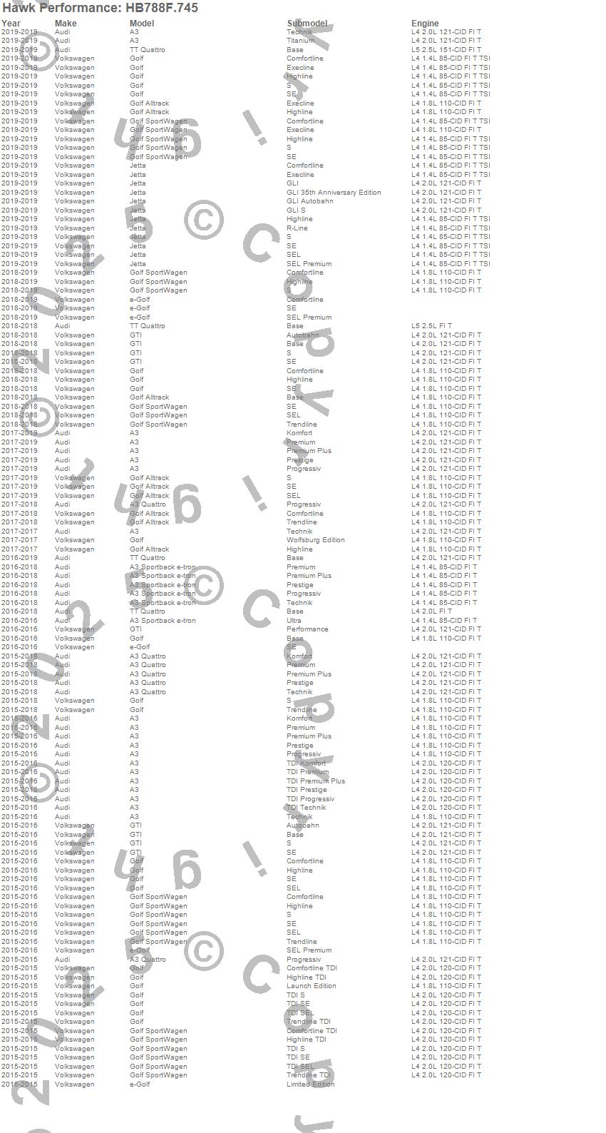Below is an abreviated list of applications for the HPS Disc Brake Pad.A3, A3 Quattro, A3 Sportback e-tron, e-Golf, Golf, Golf Alltrack, Golf SportWagen, GTI, Jetta, TT Quattro, Audi, Volkswagen, 2019, 2018, 2017, 2016, 2015 moreā¦