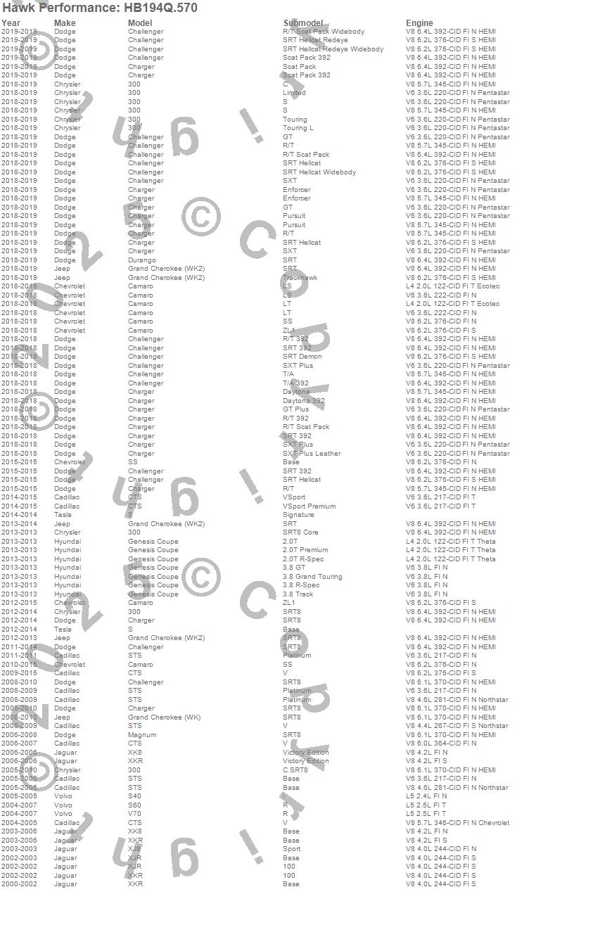 Below is an abreviated list of applications for the DTC-80 Disc Brake Pad.300, Camaro, Challenger, Charger, CTS, Durango, Genesis Coupe, Grand Cherokee (WK), Grand Cherokee (WK2), Magnum, S, S40, S60, SS, STS, V70, XJ8, XJR, XK8, XKR moreā¦