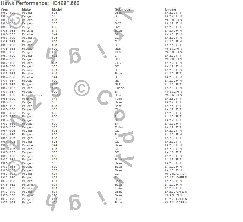 Below is an abreviated list of applications for the HPS Disc Brake Pad.504, 505, 560SL, 604, 924, 928, 944, Mercedes-Benz, Peugeot, Porsche, 1989, 1988, 1987, 1986, 1985, 1984, 1983, 1982, 1981, 1980 moreā¦
