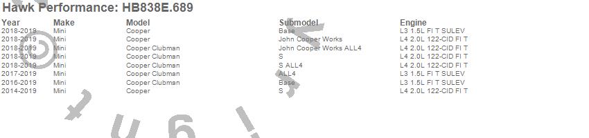 Below is an abreviated list of applications for the Blue 9012 Disc Brake Pad.Cooper, Cooper Clubman, Mini, 2019, 2018, 2017, 2016, 2015, 2014 moreā¦