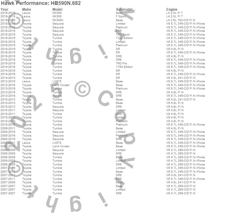 Below is an abreviated list of applications for the HP Plus Disc Brake Pad.Land Cruiser, LX570, NX300, NX300h, Sequoia, Tundra, Lexus, Toyota, 2019, 2018, 2016, 2015, 2014, 2013, 2012, 2011, 2010, 2009, 2008, 2007 moreā¦
