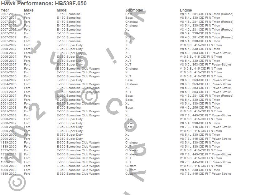 Below is an abreviated list of applications for the HPS Disc Brake Pad.E-150 Econoline, E-250 Econoline, E-350 Econoline Club Wagon, E-350 Super Duty, Ford, 2007, 2006, 2005, 2004, 2003, 2002, 2001, 2000, 1999 moreā¦