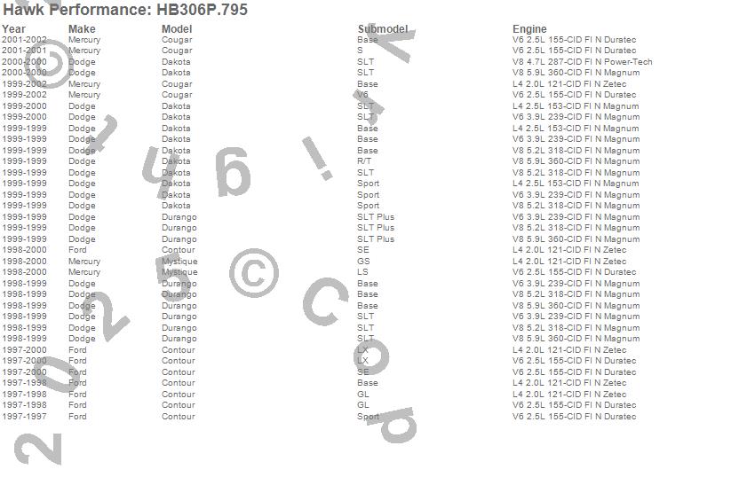 Below is an abreviated list of applications for the SuperDuty Disc Brake Pad.Contour, Cougar, Dakota, Durango, Mystique, Dodge, Ford, Mercury, 2002, 2001, 2000, 1999, 1998, 1997 moreā¦