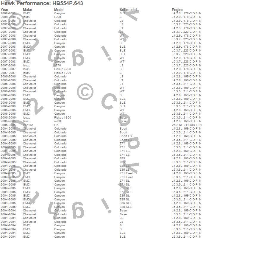 Below is an abreviated list of applications for the SuperDuty Disc Brake Pad.Canyon, Colorado, G6, i-280, i-290, i-350, i-370, Chevrolet, GMC, Isuzu, Pontiac, 2008, 2007, 2006, 2005, 2004 moreā¦