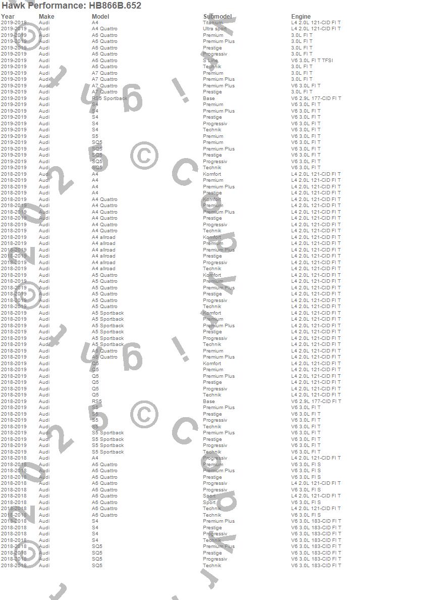Below is an abreviated list of applications for the HPS Disc Brake Pad.A4, A4 allroad, A4 Quattro, A5 Quattro, A5 Sportback, A6 Quattro, A7 Quattro, Q5, RS5, RS5 Sportback, S4, S5, S5 Sportback, SQ5, Audi, 2019, 2018 moreā¦