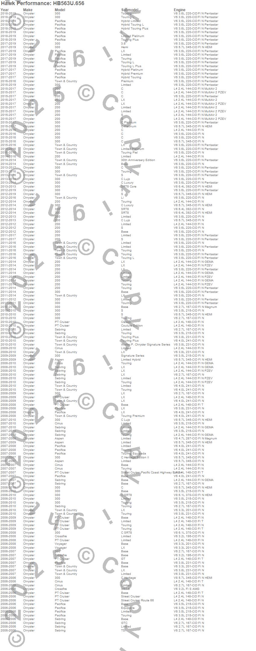 Below is an abreviated list of applications for the DTC-70 Disc Brake Pad.200, 300, Aspen, Cirrus, Crossfire, Pacifica, PT Cruiser, Sebring, Town & Country, Voyager, Chrysler, 2019, 2018, 2017, 2016, 2015, 2014, 2013, 2012, 2011 moreā¦