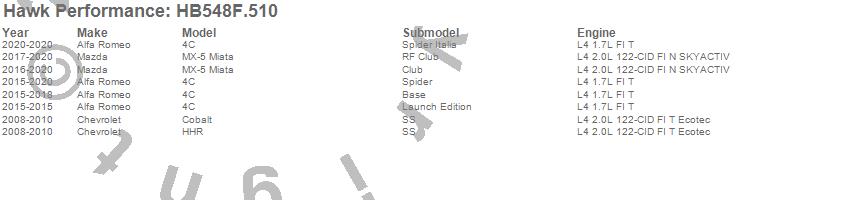 Below is an abreviated list of applications for the HPS Disc Brake Pad.4C, Cobalt, HHR, MX-5 Miata, Alfa Romeo, Chevrolet, Mazda, 2020, 2019, 2018, 2017, 2016, 2015, 2010, 2009, 2008 moreā¦
