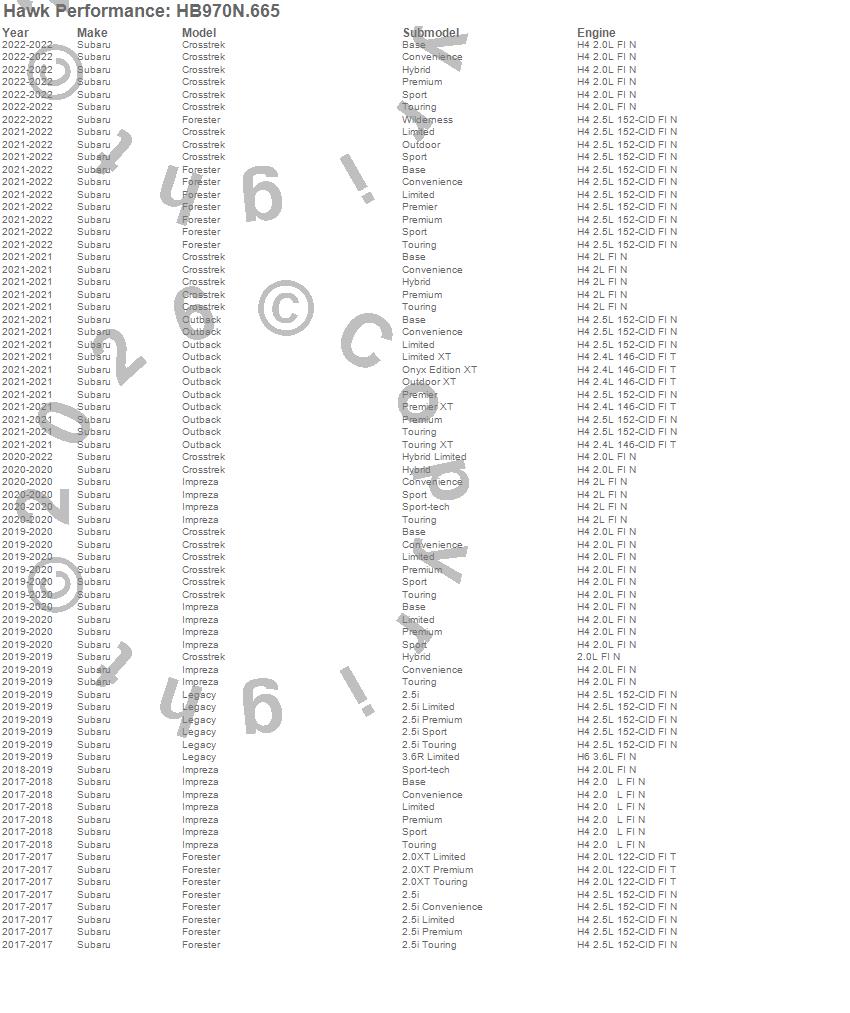 Below is an abreviated list of applications for the HP Plus Disc Brake Pad.