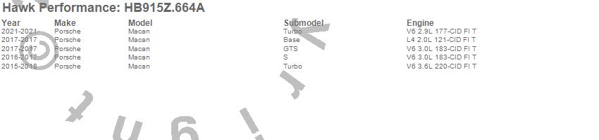 Below is an abreviated list of applications for the Performance Ceramic Disc Brake Pad.Macan, Porsche, 2021, 2018, 2017, 2016, 2015 moreā¦