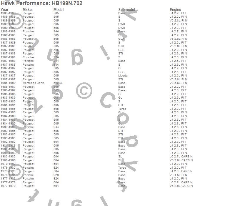 Below is an abreviated list of applications for the HP Plus Disc Brake Pad.504, 505, 560SL, 604, 924, 928, 944, Mercedes-Benz, Peugeot, Porsche, 1989, 1988, 1987, 1986, 1985, 1984, 1983, 1982, 1981, 1980 moreā¦