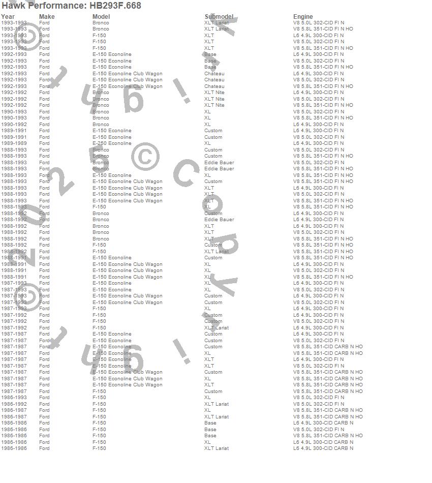 Below is an abreviated list of applications for the HPS Disc Brake Pad.Bronco, E-150 Econoline, E-150 Econoline Club Wagon, E-250 Econoline, F-150, Ford, 1993, 1992, 1991, 1990, 1989, 1988, 1987, 1986 moreā¦