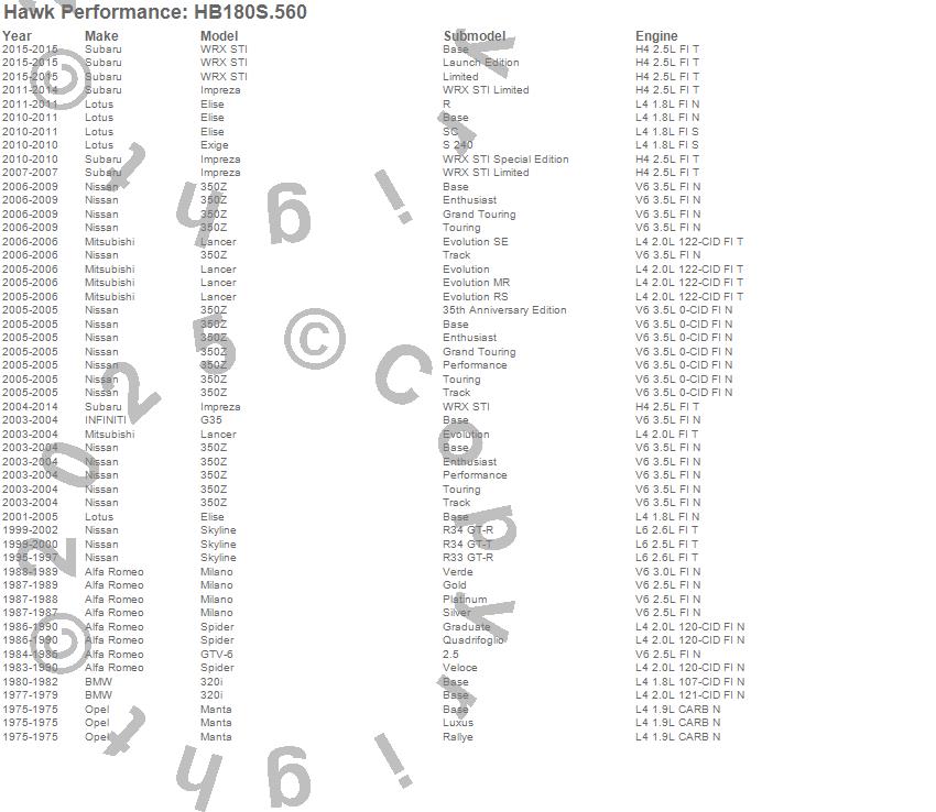 Below is an abreviated list of applications for the HT-10 Disc Brake Pad.320i, 350Z, Elise, Exige, G35, GTV-6, Impreza, Lancer, Manta, Milano, Skyline, Spider, WRX STI, Alfa Romeo, BMW, INFINITI, Lotus, Mitsubishi, Nissan, Opel moreā¦