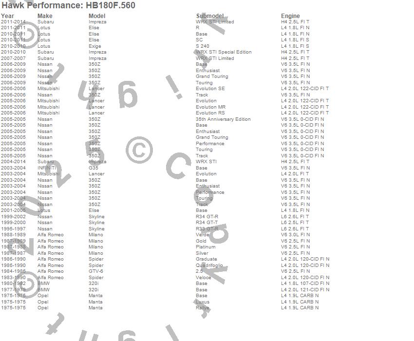 Below is an abreviated list of applications for the HPS Disc Brake Pad.320i, 350Z, Elise, Exige, G35, GTV-6, Impreza, Lancer, Manta, Milano, Skyline, Spider, Alfa Romeo, BMW, INFINITI, Lotus, Mitsubishi, Nissan, Opel, Subaru moreā¦