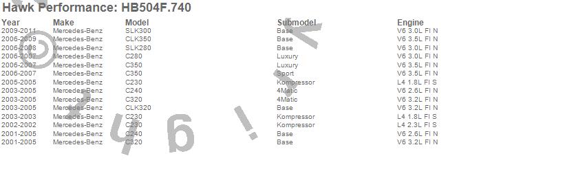 Below is an abreviated list of applications for the HPS Disc Brake Pad.C230, C240, C280, C320, C350, CLK320, CLK350, SLK280, SLK300, Mercedes-Benz, 2011, 2010, 2009, 2008, 2007, 2006, 2005, 2004, 2003, 2002 moreā¦